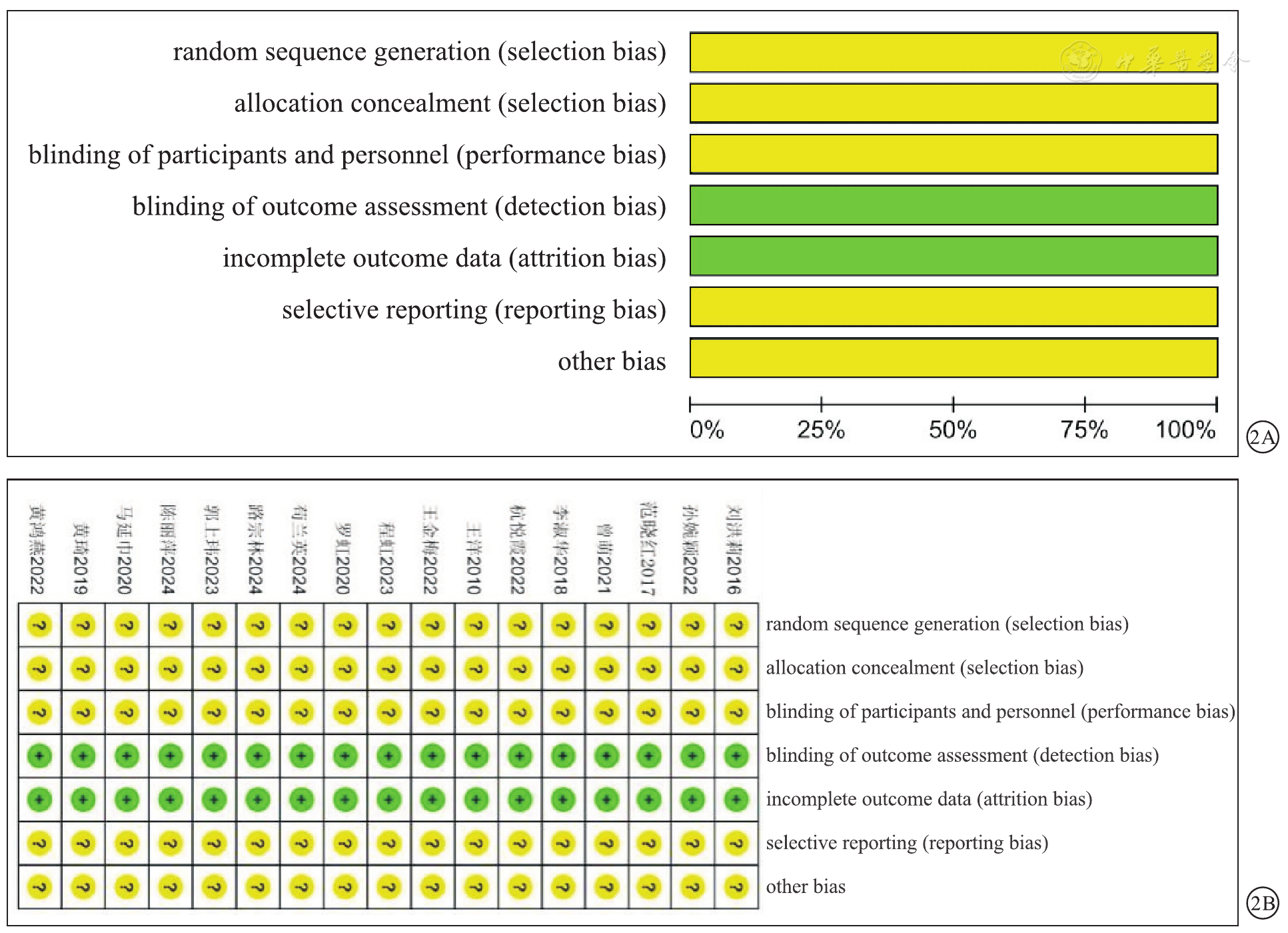 图2 本研究纳入关于采用手术治疗剖宫产术后IPPH患者疗效的研究文献偏倚风险评估图(图2A:概要图;图2B:详图)注:绿色表示低偏倚风险,黄色表示偏倚风险不明确。IPPH为难治性产后出血。random sequence generation (selection bias)为随机序列产生(选择偏倚),allocation concealment (selection bias)为分配隐藏(选择偏倚),blinding of participants and personnel (performance bias)为受试者与研究人员设盲(实施偏倚),blinding of outcome assessment (detection bias)为结局评价者设盲(检测偏倚),incomplete outcome data (attrition bias)为结局数据不完整(失访偏倚/损耗偏倚),selective reporting (reporting bias)为选择性报告(报告偏倚),other bias为其他偏倚