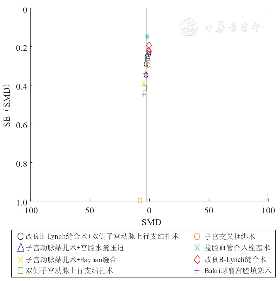 按照本研究设定的文献检索策略,共计纳入关于手术治疗剖宫产术后IPPH患者疗效研究文献为17篇,文献质量均为B级,文献异质性较大;涉及775例采用手术治疗剖宫产术后IPPH患者,共计采用8种手术治疗方法,以PPH量为疗效指标的SMD分别如下。改良B-Lynch缝合术+双侧子宫动脉上行支结扎术疗效的SMD为-2.07(95%CI:-3.14~-1.00,P<0.001);改良B-Lynch缝合术疗效的SMD为-0.59(95%CI:-0.84~-0.34,P<0.001);双侧子宫动脉上行支结扎术疗效的SMD为-2.77(95%CI:-4.91~-0.64,P<0.001);子宫动脉结扎+宫腔水囊压迫疗效的SMD为-1.27(95%CI:-1.76~-0.77,P<0.001);子宫动脉结扎+Hayman缝合术疗效的SMD为-5.24(95%CI:-6.01~-4.48,P<0.001);Bakri球囊宫腔填塞术疗效的SMD为-3.71(95%CI:-4.77~-2.65,P<0.001);盆腔血管介入栓塞术疗效的SMD为-1.63(95%CI:-1.92~-1.34,P<0.001);子宫交叉捆绑术疗效的SMD为-4.52(95%CI:-11.26~-2.22,P=0.190)。8种手术治疗方法疗效的合并效应量,即疗效的总体SMD为-2.46(95%CI:-3.09~-1.82,P<0.001),研究组(8种方法之一)的疗效优于对照组,并且差异均有统计学意义(P<0.05)。
