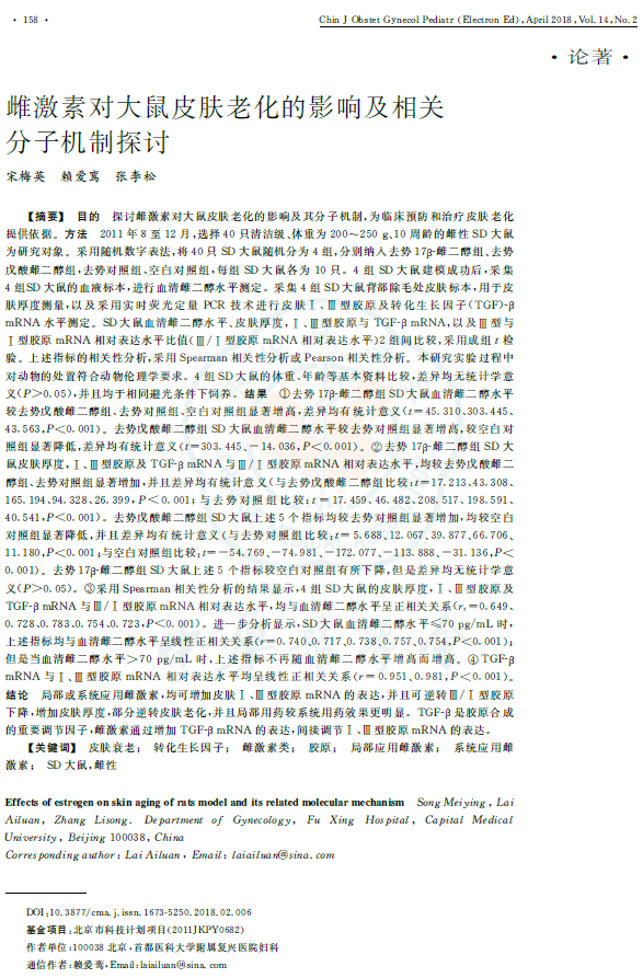 《雌激素对大鼠皮肤老化的影响及相关分子机制探讨》(链接网址:http://rs.yiigle.com/CN119273201802/1040130.htm)