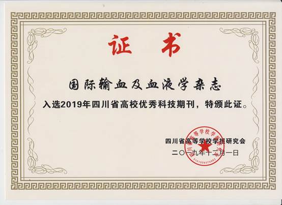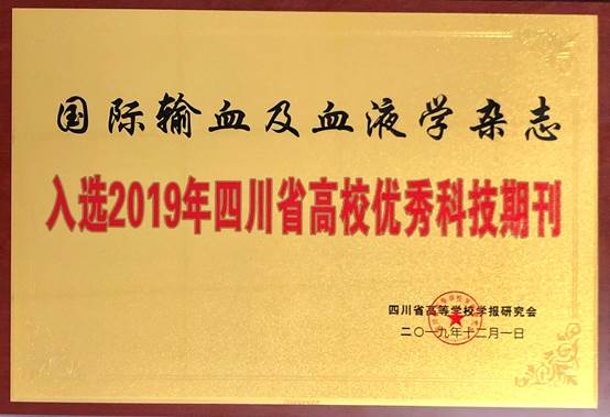 《国际输血及血液学杂志》被评选为“2019年四川省高校优秀科技期刊”
